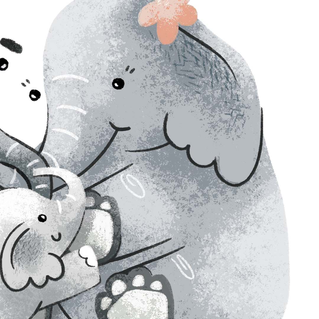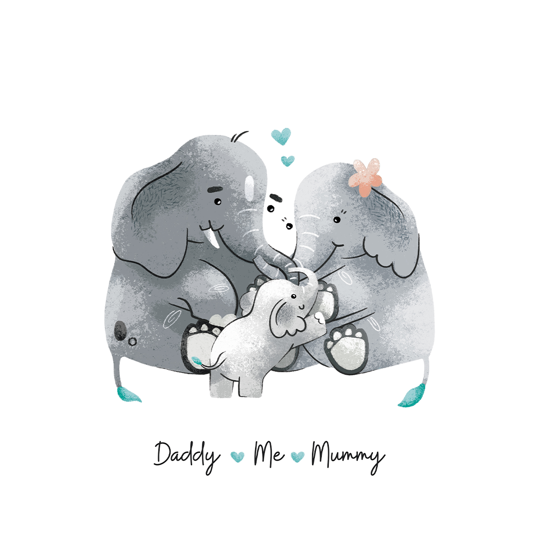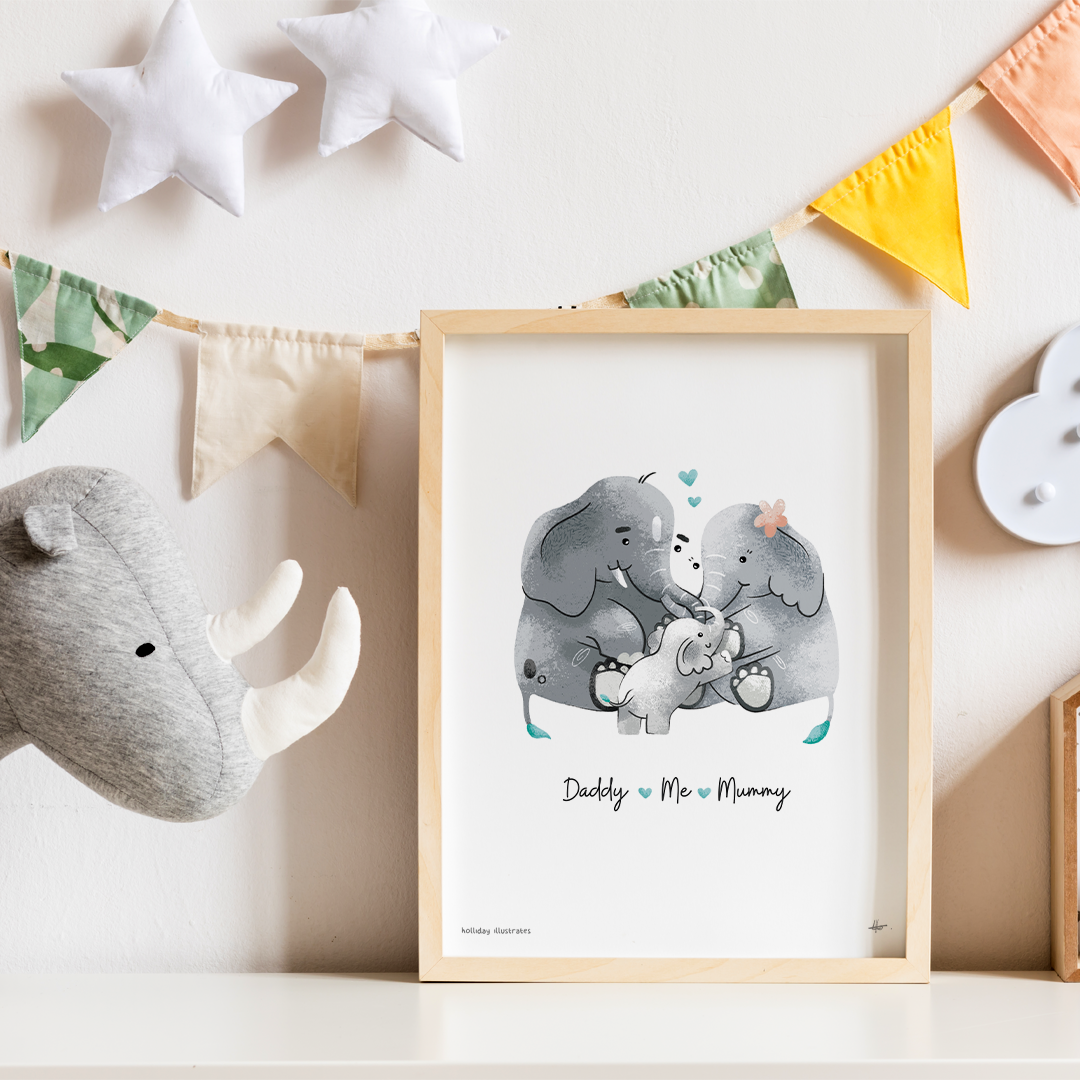 This charming print captures the heartwarming scene of a mummy, daddy and baby elephant, happily playing together as a loving family. Illustrated with soft, pastel colours and intricate details, it brings a sense of joy and harmony to any space.